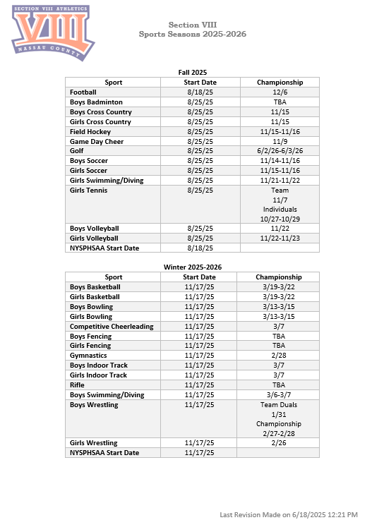 Section VIII Sports Seasons 2025-2026